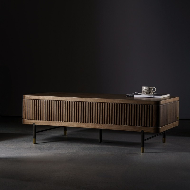 Низкий журнальный стол «Канеле» из коллекции Togas оформлен реечными панелями из массива ореха и ножками из черного металла с отделкой цвета состаренной латуни. Насыщенный ореховый оттенок шпона «Канеле» дополнит современные интерьеры. Такой стол будет эффектным акцентом в гостиной.